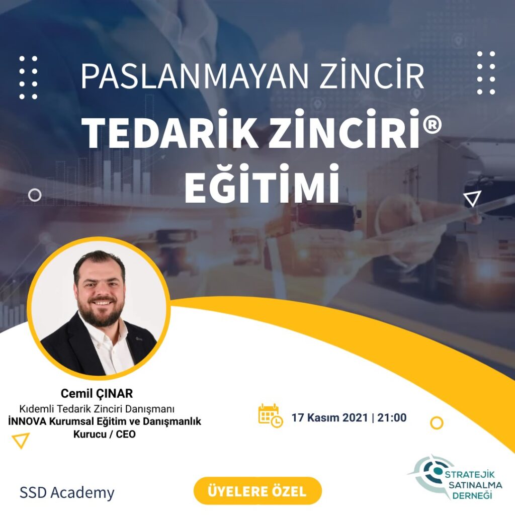 SSD Eğitim 10’da Yönetim Kurulu Üyemiz Sn Cemil Çınar ile 17.11.2021 Saat 21:00 de Paslanmaz Zincir Tedarik Zinciri üzerine eğitimimizi gerçekleştirdik. Talep planlamadan üretim süreçlerine kadar tüm konular üzerine derin bilgi paylaşımı ve soru cevaplarla katma değeri yüksek bir eğitim oldu.